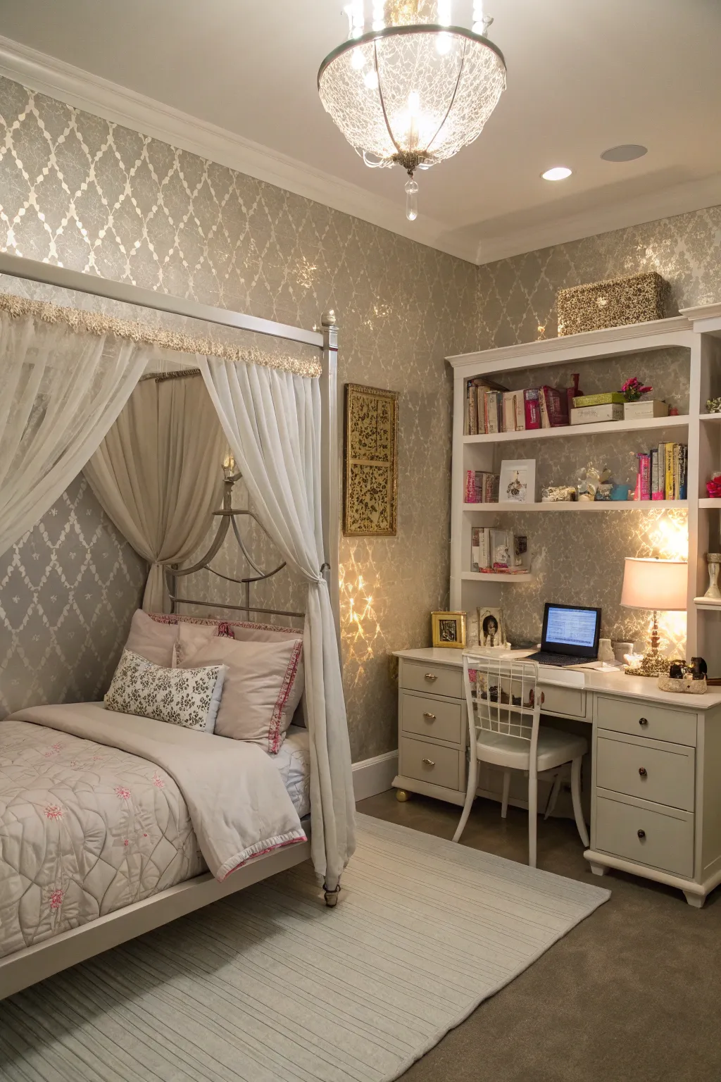 Metallic-accented wallpaper introduces subtle glamour without overpowering the room. Gentle shimmers, gold flecks, or pearlescent finishes catch the light beautifully and add a touch of magic. This style is perfect for girls who love a bit of sparkle while still maintaining a refined, cozy environment.