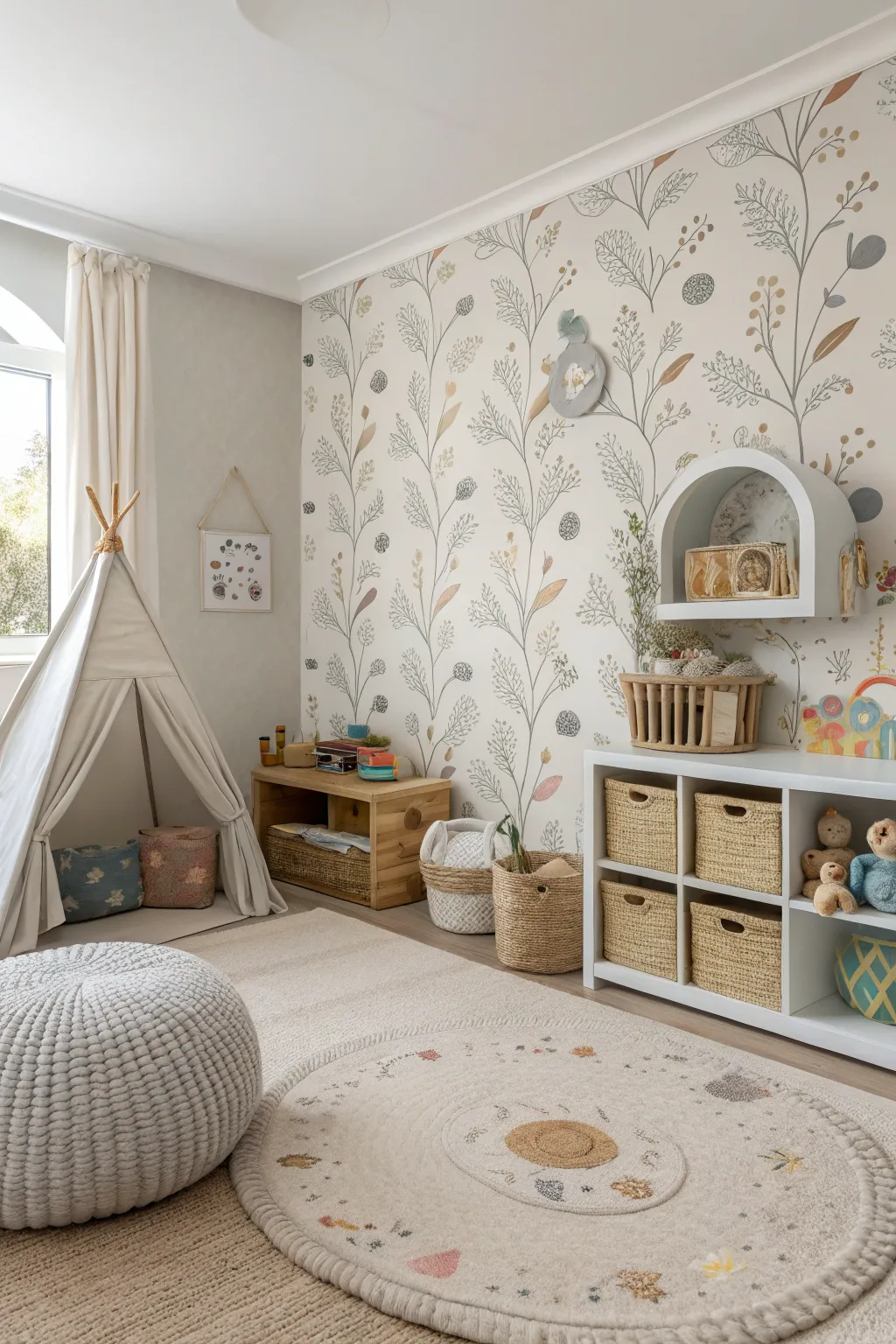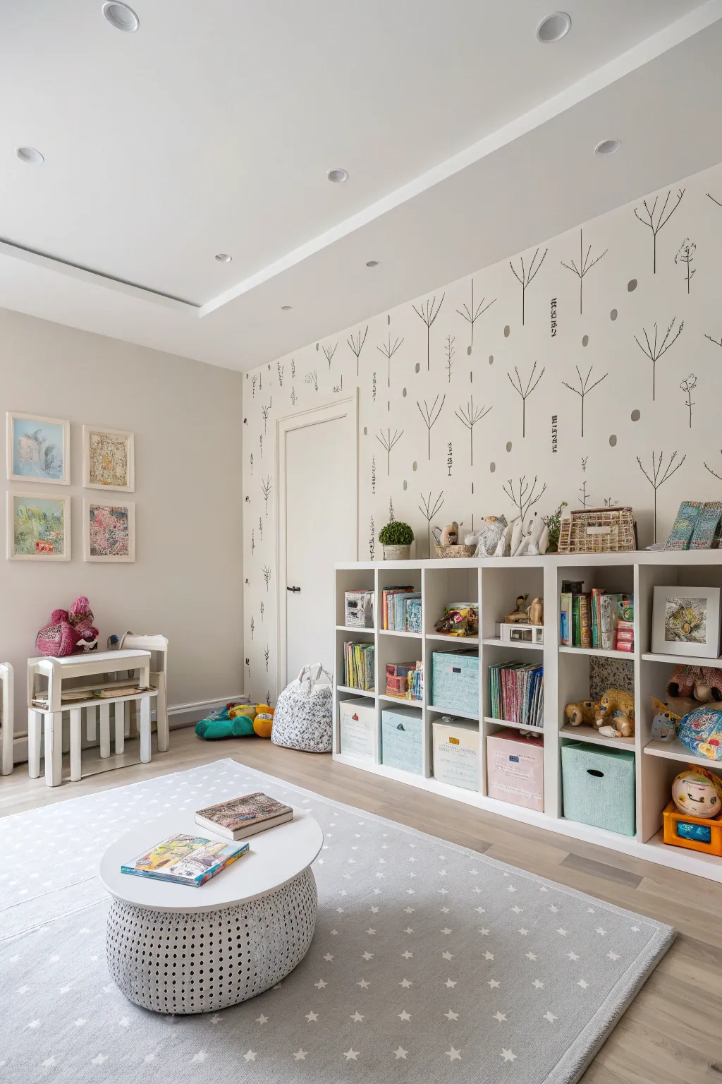 Simple wallpaper designs can be just as powerful. Soft patterns, gentle shapes, or light textures keep the room open and flexible. Minimalist styles allow toys, books, and activities to stand out. This approach works well for shared playrooms or smaller spaces.