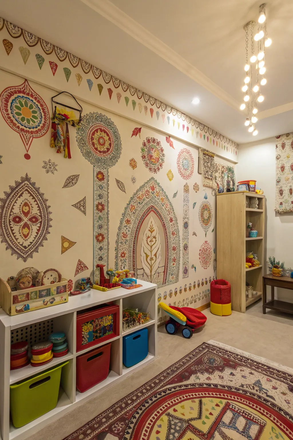 Mixing patterns adds energy and movement to a playroom. Stripes, dots, stars, and shapes can coexist if balanced well. Patterned wallpaper keeps the room lively and visually interesting. It’s perfect for creative kids who enjoy variety.