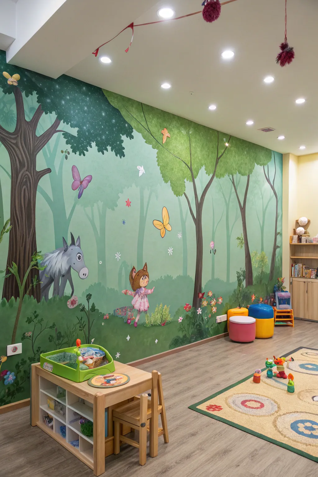 Forest murals create a storybook feel. Trees, animals, and hidden details invite kids to explore the walls. These designs help children feel like they’re inside a fairytale. They work beautifully in reading corners and quiet play areas.