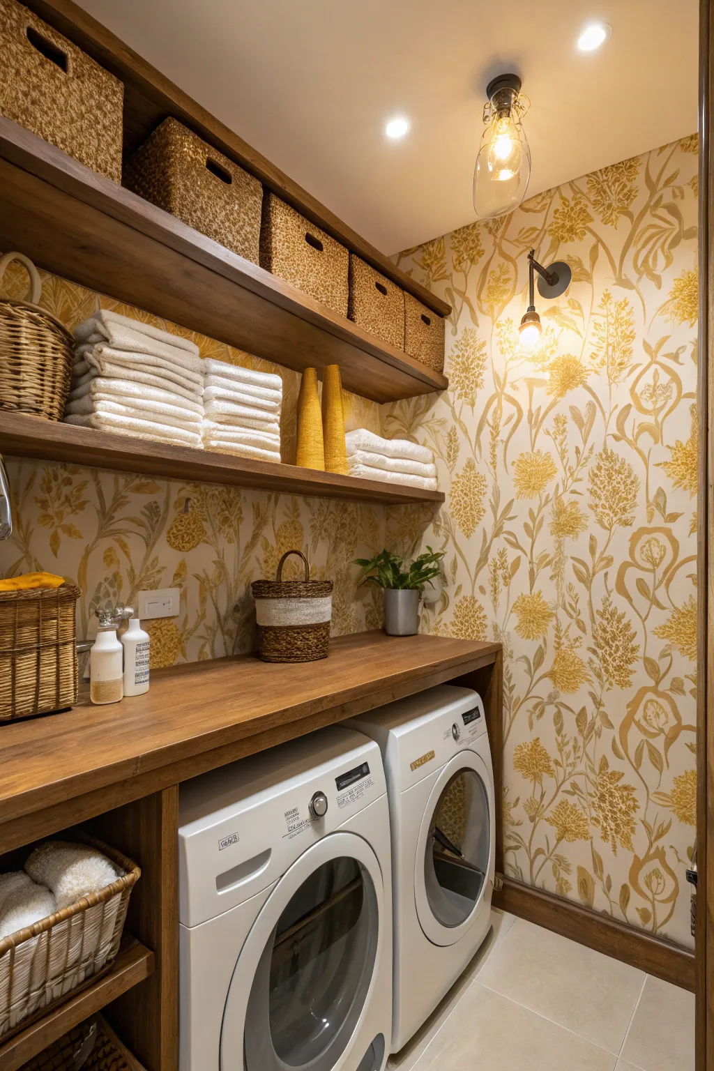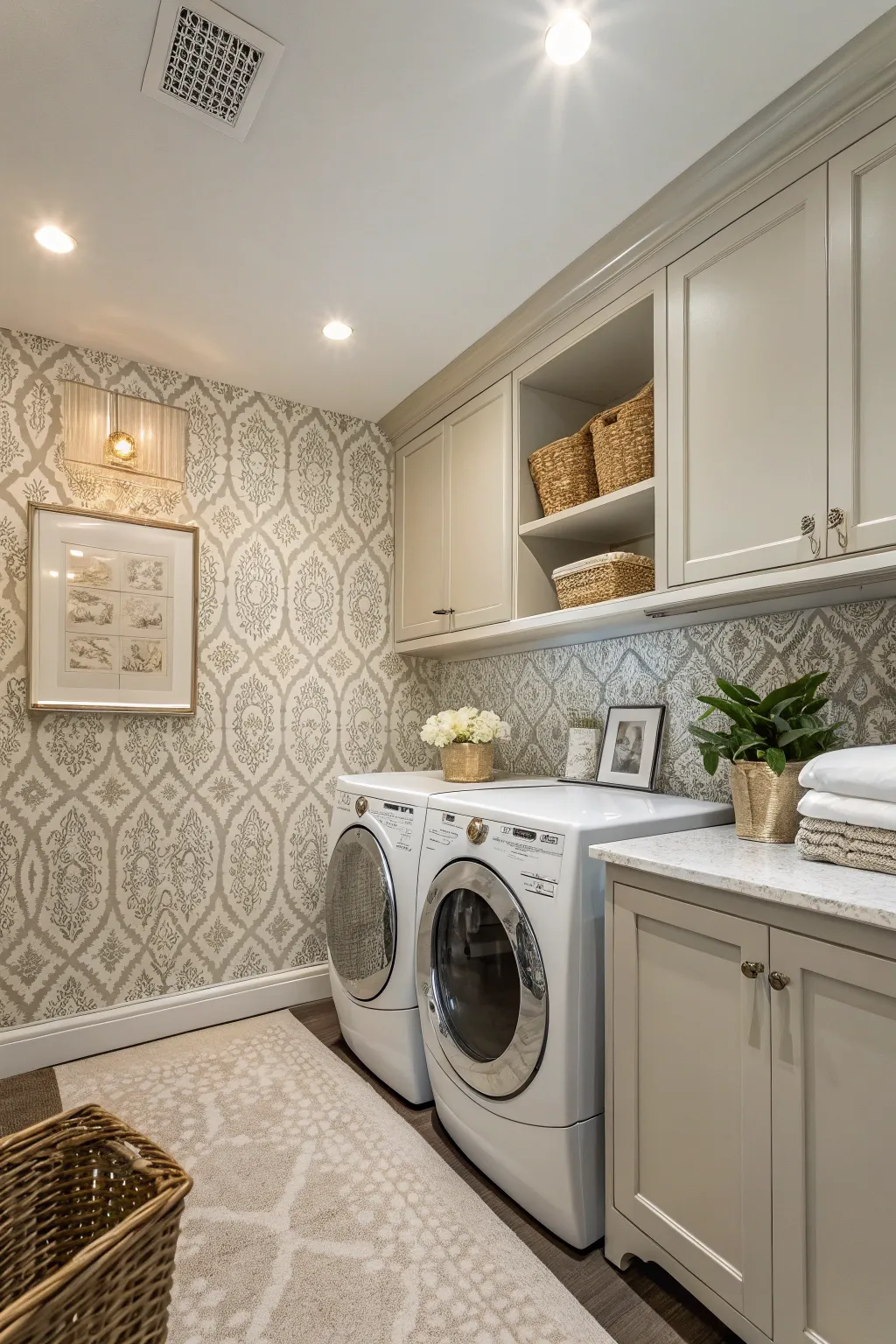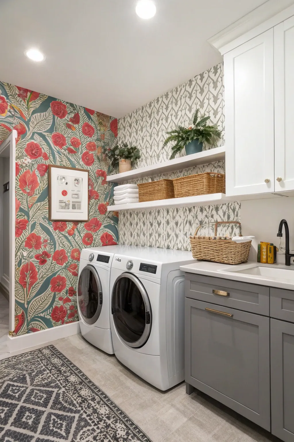 You don’t need wallpaper on every wall. One feature wall can change everything. Choose the wall behind the washer and dryer or the folding station.