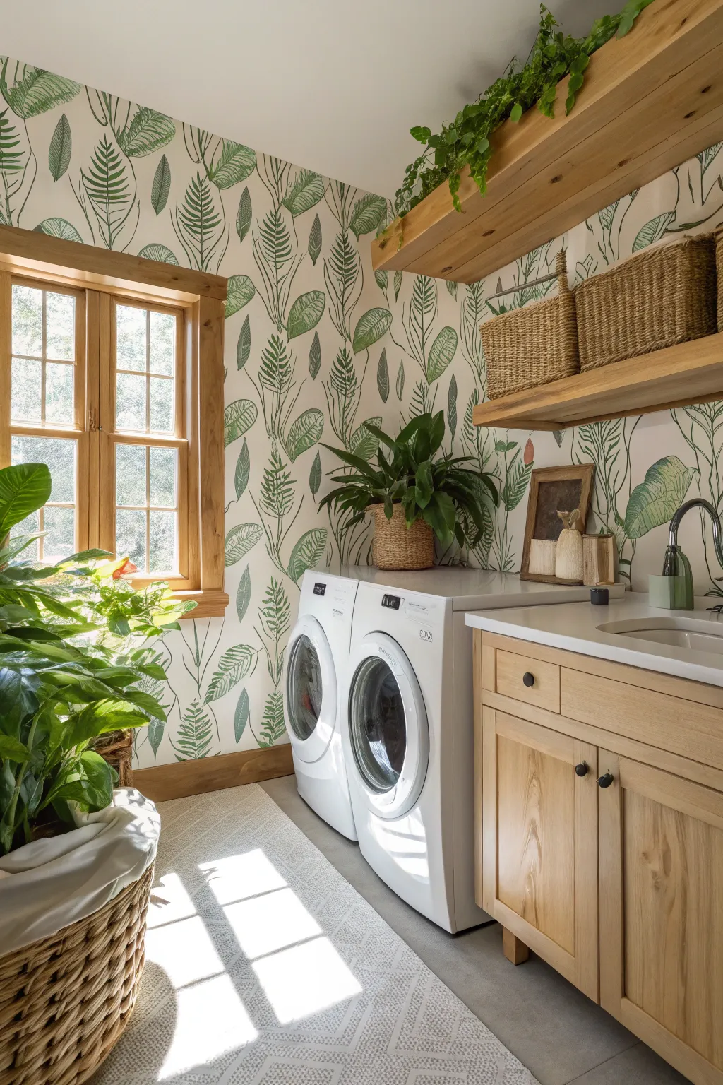 Nature-inspired wallpaper brings calm into a space that’s usually all about noise and movement. Leaf patterns, soft vines, or organic shapes work beautifully in laundry rooms.