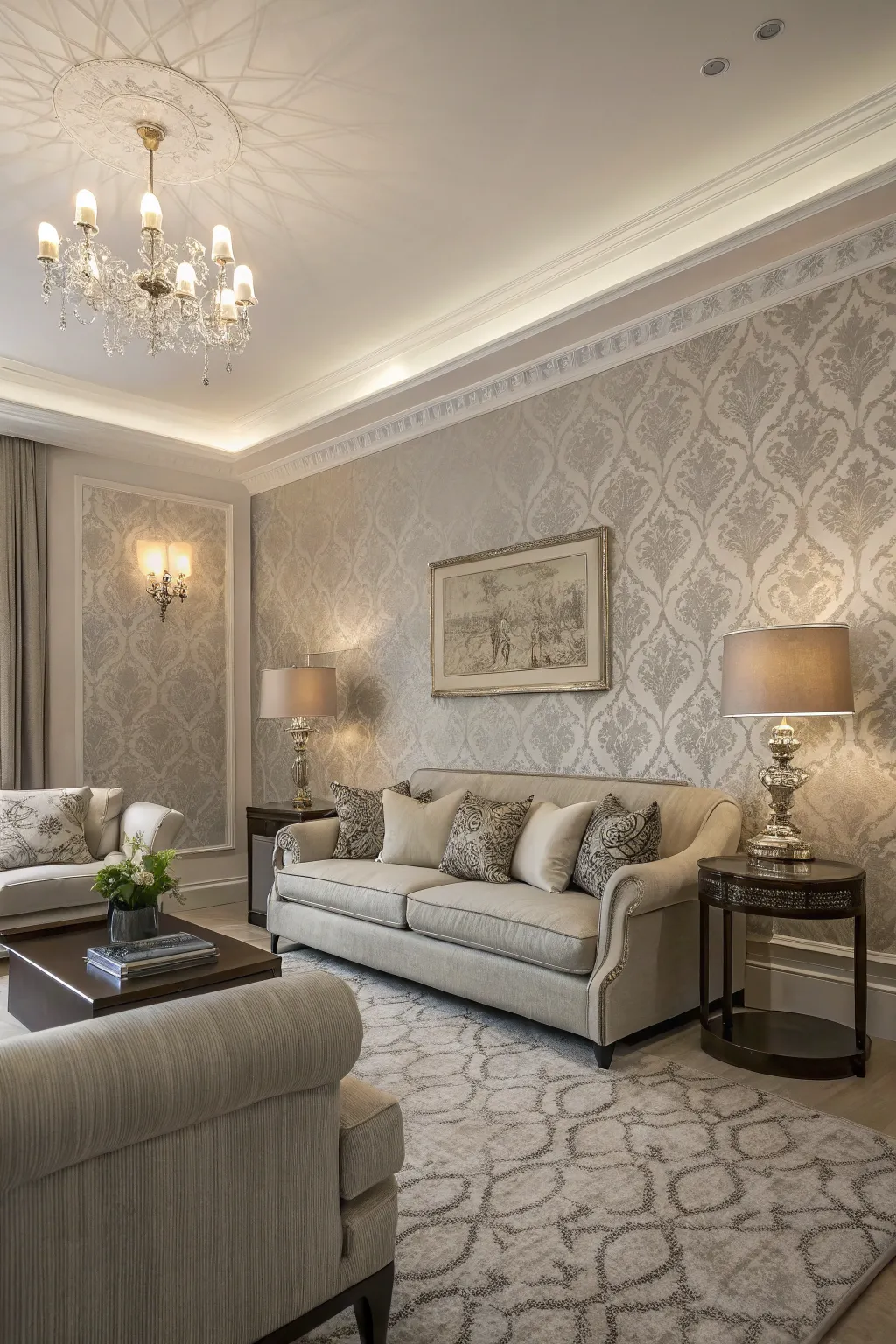 Damask wallpaper offers a classic and timeless look. It adds elegance without feeling too formal. This style works well in both modern and traditional living rooms. When paired with neutral furniture, damask patterns create a refined and welcoming atmosphere.